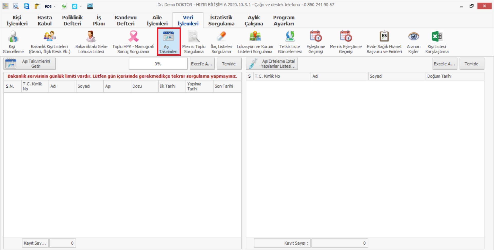 Sol tarafta bulunan Aşı Takvimlerini Getir butonu ile yereldeki aşı takvimlerinizi güncelleyebilirsiniz. Bakanlıktan tarafından günlük 80 kişi sorgulama hakkınız bulunmaktadır. Lütfen gün içerisinde gerekmedikçe sorgulama yapmayınız. Yaş aralığına göre sorgulama yapmak isterseniz destek hattımızı arayabilirsiniz.